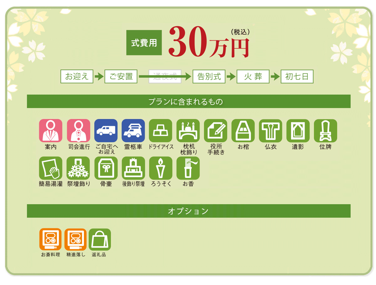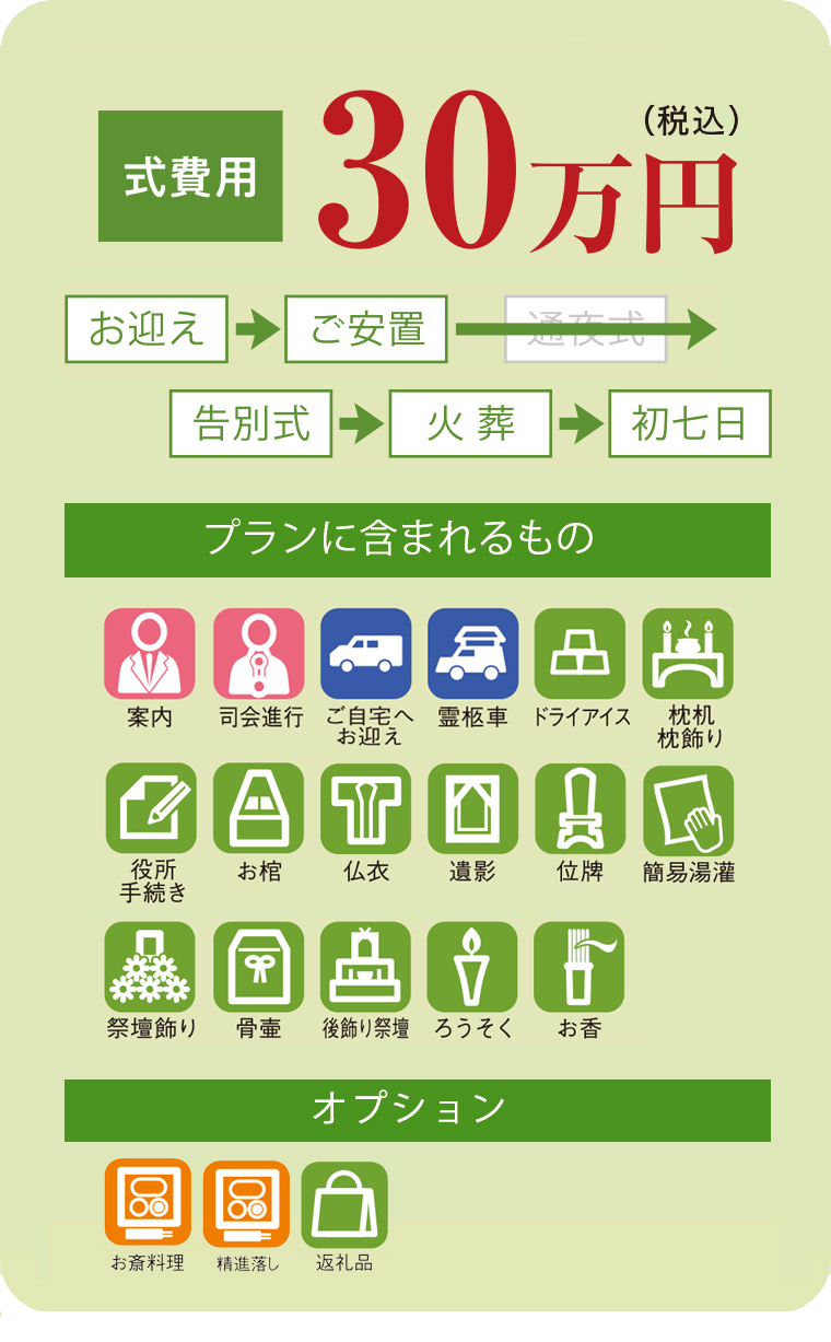 お斎料理は省き、仏具は必要最低限に抑えつつ、葬儀式はしっかりと行うプランです。