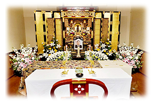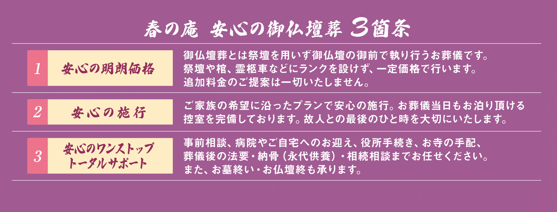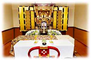 御仏壇葬儀とは祭壇を用いず御仏壇の御前で執り行うお葬儀です。祭壇や棺、霊柩車などにランクを設けず、一定価格で行います。追加料金のご提案は一切いたしません。